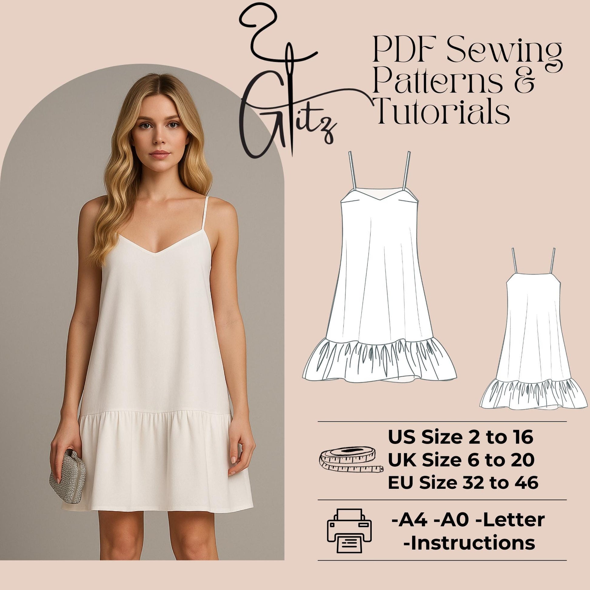 Ruffle Slip Dress Sewing Pattern | Digital PDF | Women's A-Line Mini Dress with Straps and Bust Darts | Easy Summer Dress for Woven Fabrics